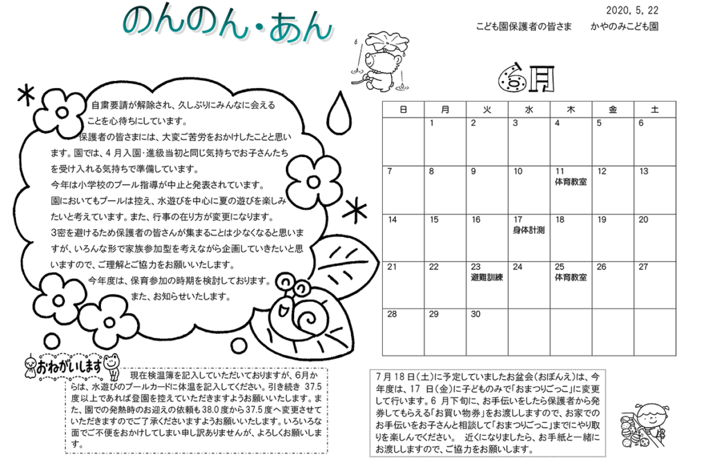 【園から皆さまへ】自粛要請が解除され、久しぶりにみんなに会えることを心待ちにしています。保護者の皆さまには、大変ご苦労をおかけしたことと思います。園では、4月入園・進級当初と同じ気持ちでお子さんたちを受け入れる気持ちで準備しています。今年...