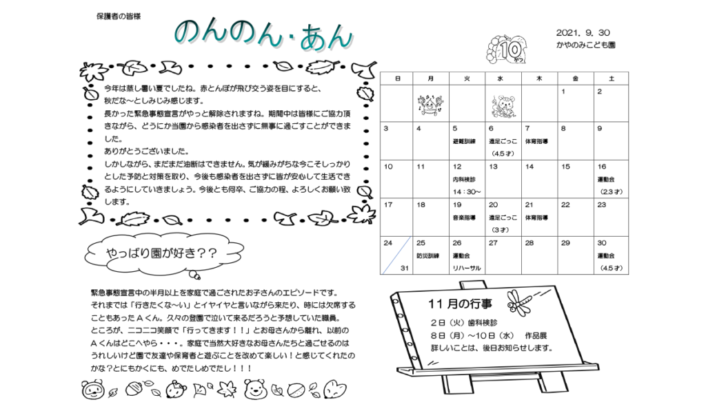 | 10 | 11 | 12 内科検診 14:30~ | 13 遠足ごっこ (3才) | 14 | 15 | 16 運動会 (2.3才) |