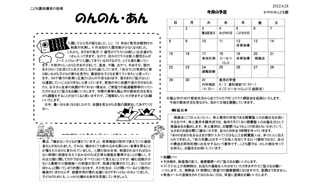 午前中にしっかりと外あそびをして、昼食、午睡、おやつ、外あそび、室内あそびという生活リズムを大切にしながら過ごしています。「自分で」の気持ちに寄り添いながら子どもの育ちを見守り、意欲的な子どもを育てていきたいと思っています。コロナ禍での保育に正直たくさんの不安もあります。皆さまのご協力なしには運営していくことはできないと思っています。家族の中に体調不良の方がおられたり、お子さん自身の体調がすぐれない場合は、ご家庭での経過観察等行っていただけるようご協力をお願いいたします。年間行事等も福山市の感染状況を見ながら調整をすることが出てくると思いますので、ご理解をしていただきますようお願いいたします。