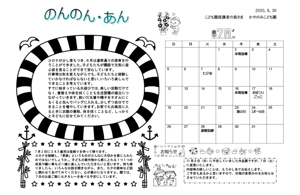 コロナを経験し、「家族」というものがどんなに大切かを感じられたのではないでしょうか。子どもの製作物から感じとれる1つ1つの成長や願い事など一緒に楽しんでいただきたいと思います。持ち帰りましたら、いろんなお話を聞きながら、また、七夕の意味など話し聞かせてあげてみてください。心が豊かになりますよ。園では、7日のお昼ご飯に七夕カレーを食べる予定にしています。
