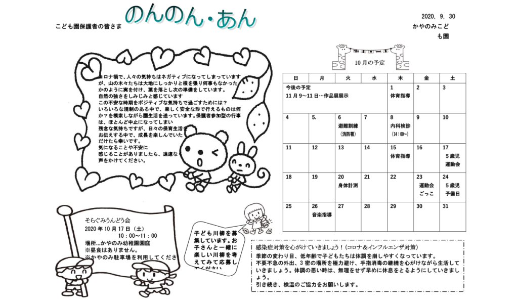 いろいろな規制のある中で、楽しく安全な形で行えるものは何か?を模索しながら園生活を送っています。保護者参加型の行事は、ほとんど中止になってしまい残念な気持ちですが、日々の保育生活をお伝えする中で、成長を楽しんでいただけたら幸いです。