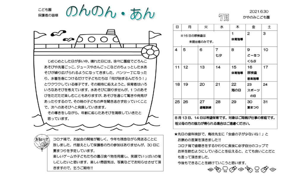 コロナ禍で、お盆会の開催が難しく、今年も残念ながら見送ることに致しました。代替えとして保護者の方の参加はありませんが、30日に夏まつりを予定しています。