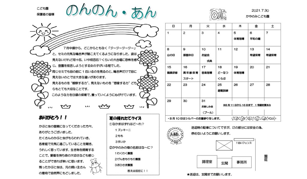7月中頃から、どこからともなく「ジージージージー」と、セミの元気な鳴き声が聴こえてくるようになりました。姿は見えないけれど何十匹、いや何百匹?くらいの大合唱に恐怖を感じ、登園を拒否しようとする女の子がいる程でした。